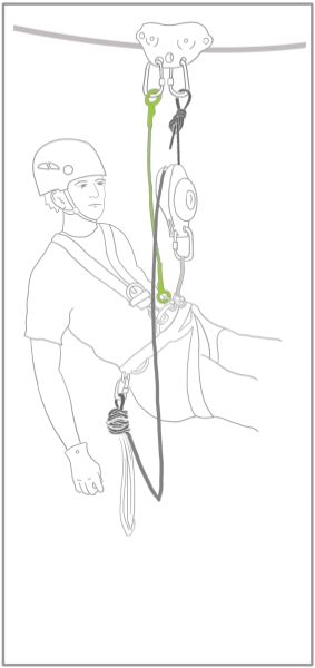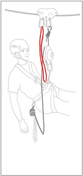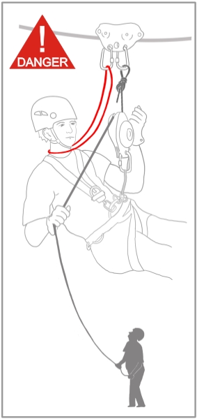 Strangulation des Halses durch eine Backup-Schlinge beim Selbstablassen von einer Seilrutsche mit Bungee-Bremse1) Beschreibung zum Einbinden der Sicherung an der Seilrutsche und des Selbstablassens nach dem Rutschvorgang (wie am betroffenen Standort durchgeführt)Die Teilnehmer auf dieser Seilrutsche (mit Bungee-Bremse) werden mit zwei unabhängigen Sicherungsmitteln mit Seilrutschenrolle verbunden (siehe Bild rechts oben):